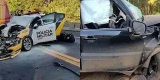 A Polícia Rodoviária Federal (PRF) informou que pelo menos quatro veículos se envolveram na batida, entre eles a viatura da PM.