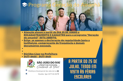 A Prefeitura Municipal de São João do Ivaí anuncia que a partir desta terça-feira, 25 de junho, estará aberto o período de recadastramento e cadastro para o Programa Geração do Amanhã. Este programa é voltado para estudantes que buscam apoio e incentivo para custeio do transporte.